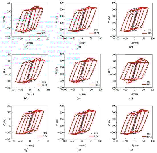 Comparisons between the hysteretic curves obtained by the FES and RFM. (a) PSRCF-1. (b) PSRCF-3. (c) PSRCF-4. (d) PSRCF-5. (e) PSRCF-8. (f) PSRCF-9. (g) PSRCF-11. (h) PSRCF-14. (i) PSRCF-15.