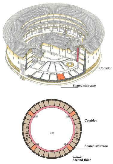 Although tulou display a variety of external appearances, such as circular, oval, square, octagonal, and half-moon shapes, their internal spatial layouts exhibit remarkable consistency. These layouts can be categorized into two distinct types in China: Hakka tulou and Minnan tulou. Hakka tulou is characterized by an inner corridor layout, where space is organized around circular corridors with multiple communal staircases (Figure 9). In contrast, Minnan tulou features a unit layout composed of identical, sequential residential units, each with its own separate entrance and private staircase that extends across all floors [19] (Figure 10).