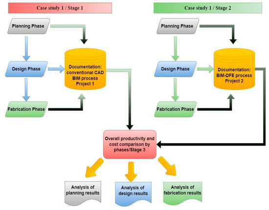The objective of a case study is to identify the relationship between the causes and effects of conditions applied in a certain process and to replicate the advantages in similar processes [44]. The data collected from the selected projects are used to conduct a comparative analysis of the costs and benefits [45] of the BIM-DFE integration methodology in the planning, design, and manufacturing phases of steel construction projects. The following workflow was applied in this study: (1) documentation of the processes in Project 1 (case study 1) using the traditional CAD-BIM methodology; (2) documentation of the processes in Project 2 (case study 2) using the BIM-DFE integration methodology; and (3) comparison of the overall productivity of different phases. The research workflow is shown in Figure 1.