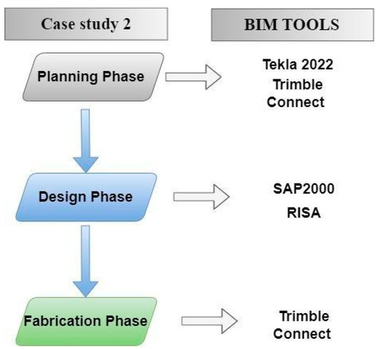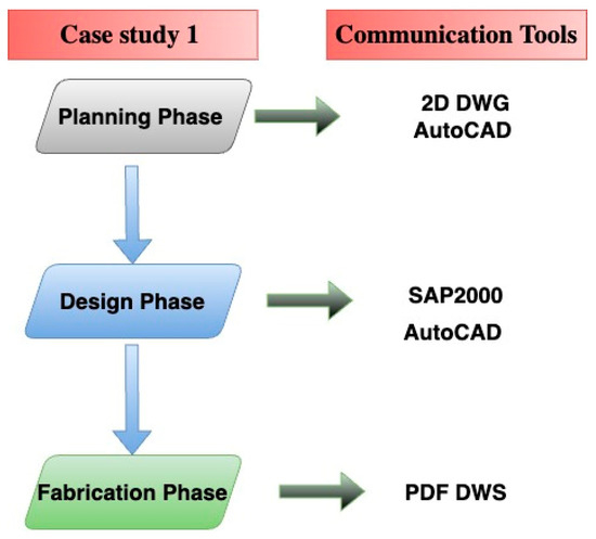 In case study 1, the traditional CAD-BIM methodology was used in the planning, design, and fabrication phases of a steel construction project, in which a total of 140 h was spent on planning: 60 h by the project manager/senior engineer and 80 h by a senior draftsman. The software tools used were AutoCAD and SAP2000. One disadvantage in this case was the use of two software tools that did not consider the transfer of nongraphical information between them, which slowed the planning process. Moreover, the presentation of 2D drawings to the client, who was not an expert in the construction industry, hindered their understanding of the project, which increased the period until the final design was approved.
