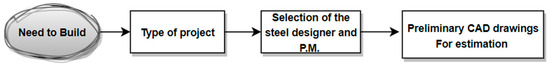 The second subprocess is selecting the type of project that meets the needs of the client and the capabilities of the company being studied. The main objective is to determine whether the project should be industrial or commercial according to the specifications and requirements of the client. Factors such as the project location, and the size, complexity, and end-use of the structure were analyzed. The project type was categorized as industrial. To proceed to the next step, the available resources (e.g., personnel to conduct design and manufacturing) were also considered. Determining the right project type is essential to meet client expectations and ensure project profitability.