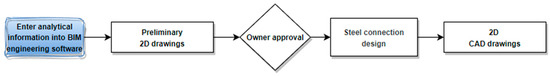 The CAD-BIM methodology is an integrated approach that combines CAD and BIM to enhance the design and construction processes in the architecture, engineering, and construction industry. This methodology has proven to be effective in information management for steel construction projects. However, it is unable to solve all the problems encountered in the industry [40,41]. In contrast, BIM for the design, fabrication, and erection of steel buildings, abbreviated BIM-DFE [1], considers the lifecycle of a project with emphasis on early integration. It focuses on the fabrication process, which accounts for the largest resource expenditures [1,9].