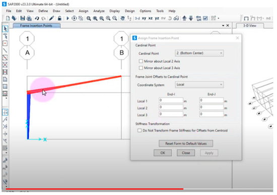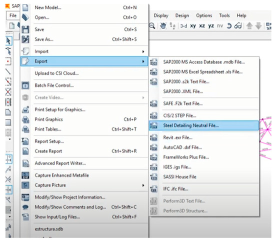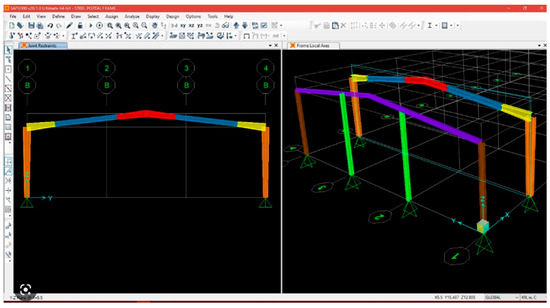 The design phase in case study 1 includes a series of subprocesses, as shown in Figure 6. The first subprocess is the entry of information from the CAD model in the previous phase into the SAP2000 software. The model is used to perform structural engineering calculations to determine the load capacity of the structure. A thorough review of the results was then conducted, followed by the required modifications to the model, including the materials selected and structural specifications. The available options were evaluated, and the section sizes that suit the needs of the project were selected, as indicated by the 3D analytical model in Figure 7. In this subprocess, a senior engineer was required to work for 80 h.