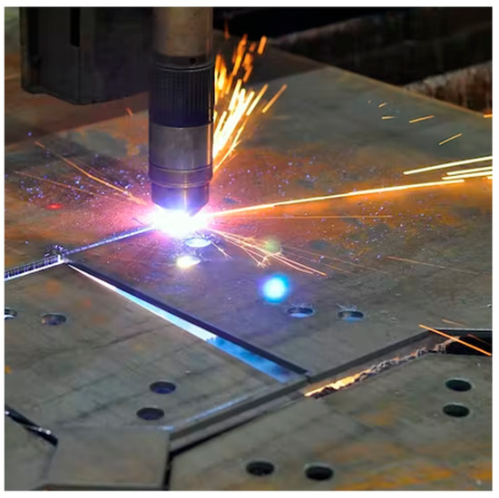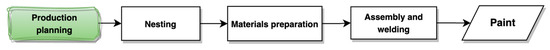 The third subprocess is material preparation, which was performed by two operators who transferred information from the previous subprocess, i.e., from “Nesting”, to the computer numerical control (CNC) plasma (Figure 13), which was used to cut the plates for processing. The operators were also tasked with cutting, roughing, chamfering, and drilling the subcomponents of the structural assemblies. This subprocess involved two factory operators who worked an average of 2.5 h/t.