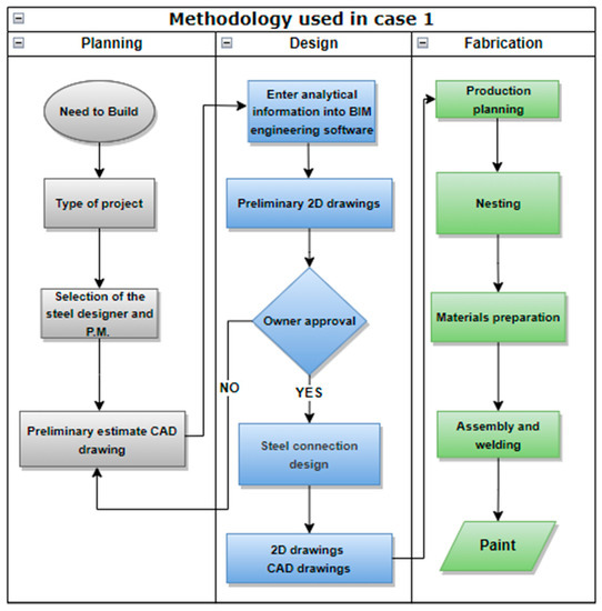 Figure 15 displays a flowchart of the CAD-BIM methodology used in case study 1, which consists of three phases (planning, design, and fabrication) and their corresponding subprocesses. The flowchart includes a breakdown of the subprocesses, such as material preparation, assembly and welding, and painting. The methodology employed provides a visual representation of the different tasks and personnel involved in each phase.
