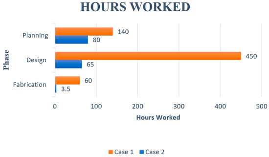 Although the sizes of the studied projects vary, the project typology, steel connections, and complexity are similar. The relevant indicators in this study are the planning, design, and fabrication phases, while transportation and erection were excluded. Figure 29 shows a comparison of the total hours worked in case studies 1 and 2 (engineers and draftsmen). The graph presents the number of hours worked by each professional in the planning, design, and fabrication phases of the project. The total hours worked in case study 2 are significantly lower than those in case study 1.