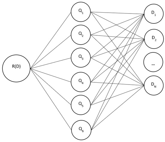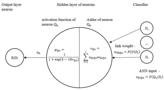Therefore, a vector of values corresponding to the damage category for each criterion, which is the input vector of ANN signals, is assigned to each defect in the classifier. Then, the input signals are sent via synapses to the corresponding neuron Qn, which is affected by the defect. Each link in the ANN has its own weight, , by which the input signal is multiplied. The link weight at the first layer of the ANN is the probability of potential damage from defect Di as assessed against criterion Qn.
