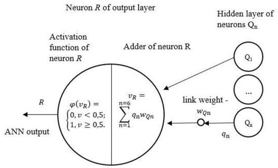 The coefficients of the logistic function of activating neurons Qn of the ANN’s hidden layer are selected in such a way that the area of the neuron output values should be within the range from 0 to 1. Then, the output of each neuron of the hidden layer qn is fed into one neuron of the ANN output layer, R, along the relevant links. Each link has its own weight, , which reflects the significance of each quality criterion for a particular structure. These weights will vary depending on the type of structures, the risk of defects of which is measured by the ANN. Neuron R sums up all risks for each criterion according to Equation (3), considers the significance coefficients of each criterion, , as shown in Figure 5.