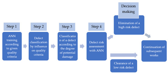 The methodology for implementing a decision support system based on the significance of a defect is shown in Figure 6. Notably, after training the ANN for a certain type of building structure according to the specified quality criteria, the decision support system will function throughout the construction without the need for retraining. Therefore, the first step of the algorithm in Figure 6 is applied only at the beginning of construction when adapting the ANN for a certain type of building structure at a specific site.