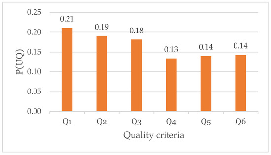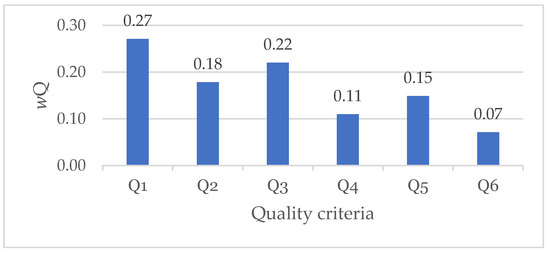 Analysis of scientific research [53,54,55] and our own developments indicated that construction quality is assessed against six basic criteria (Figure 1): Q1—purpose (strength, rigidity for load-bearing structures, tightness, for waterproofing coatings, thermal conductivity for thermal insulation, etc.); Q2—constructability (geometric dimensions, shape, composition, and structure); Q3—reliability (probability of failure, resistance to corrosion, and service life); Q4—maintainability (duration, labor intensity, and cost of recovery in the case of failure); Q5—operational safety (danger to human life and health during operation, and compliance with fire, sanitary, and environmental standards); and Q6—esthetics (design, appearance, and quality of surfaces).