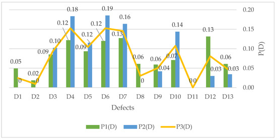 where NDi is the number of occurrences of the ith defect during the construction of cast-in-place reinforced concrete structures, and Nd is the total number of defects in cast-in-place reinforced concrete structures. The probability of defects listed in Table 1 occurring at each construction site was calculated using Equation (5). Figure 8 shows defect probabilities averaged over 12 construction projects and labeled as . Both methods used the above to determine the probability with their advantages and disadvantages. An expert opinion can highlight patterns, but it can be biased; statistical data are unbiased, but a significant number of defects and violations are not entered into the database, as many defects are fixed “in the here and now” during the delivery and acceptance of a completed project and they are not reflected in non-conformance reports. Taking this into account, in order to obtain more reliable values of probabilities , the probabilities obtained by the two above methods can be averaged to address defect probabilities, denoted in Figure 8 as .