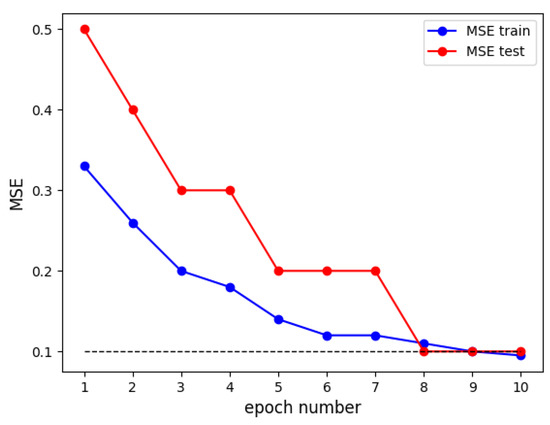 Considering the small size of the training sample, we applied statistical bootstrap technology [60] to expand it. The length of the bootstrap sample was equal to the length of the training sample. The ANN was trained using the bootstrap aggregating technology [61], which consisted of training the ANN on several separate bootstrap samples and further averaging the generated weights. The ANN’s convergence process, including the calculation of the mean square error (MSE) on the train and test samples, is shown in Figure 10. The quality of the ANN’s training was verified using cross-validation [62], and the ANN featuring the lowest MSE was selected, which required 10 bootstrap samples for training. To control overfitting, we used the sixfold cross-validation method. The resulting six models had approximately the same MSE in the range of 0–0.2.