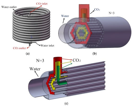- Wang, Z.H.; Li, G.C.; Zhang, Y.J.; Wang, F.; Jiang, X.; Ma, Z. Flow and heat transfer investigation of supercritical carbon dioxide in a novel biomimetic honeycomb fractal gas cooler of transcritical CO2 heat pumps. Therm. Sci. Eng. Prog. 2023, 37, 101533. [Google Scholar] [CrossRef]