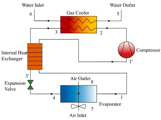 - Internal heat exchange processes 3–3′ and 1–1′: the CO2 from the gas cooler and the CO2 from the evaporator heat exchanged and were used to reduce the CO2 temperature at the throttle valve inlet and to increase the CO2 temperature at compressor suction.