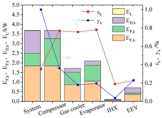 - The system exergy efficiency is 35.33% under nominal operating conditions, which has a large potential for improvement in energy utilization. The three components with the largest exergy destruction percentage are the compressor, throttle valve, and evaporator in the order of 36.13%, 22.90%, and 19.51%, respectively.