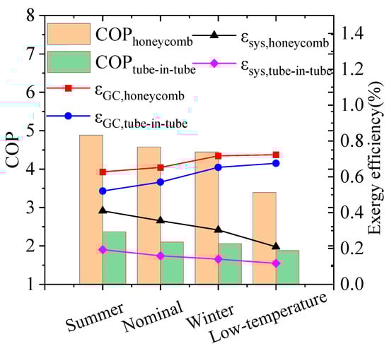 - Under the same conditions, the COP of the heat pump with the honeycomb gas cooler is significantly higher than that of the heat pump with the tube-in-tube gas cooler. The exergy efficiency of the honeycomb gas cooler is 20.51%, 14.34%, 9.76%, and 7.20% higher than that of the gas cooler type under the four typical operating conditions. The system exergy efficiencies are 52.78%, 55.19%, 53.68%, and 43.89% higher, respectively. This implies that the honeycomb gas cooler has higher energy utilization.