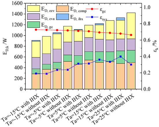 - Suggestions for the improvement and optimization of the key components are made: The compressor is the key object of system improvement, and the exergy destruction of the compressor can be reduced by improving the structural design, using higher-quality lubricating oil, etc. Next is the throttle valve; common measures include structural optimization or using an expander or injector instead. The exergy destruction of the evaporator is mainly caused by the heat exchange temperature difference in the heat exchanger; the exergy efficiency can be improved by increasing the heat exchange area and reducing the heat exchange temperature difference.