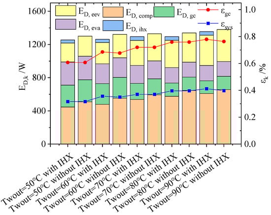 4.2. Effect of Different Forms of Gas Coolers on Exergy Destruction and Exergy Efficiency of Each Component