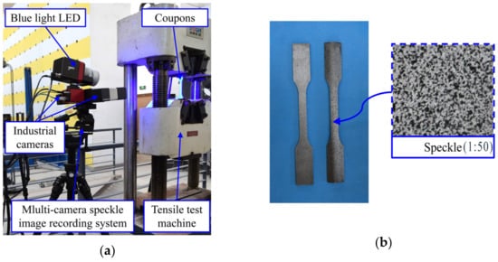 Test set-up for tensile test: (a) Test equipment with DIC measuring system; (b) Speckle of coupons.