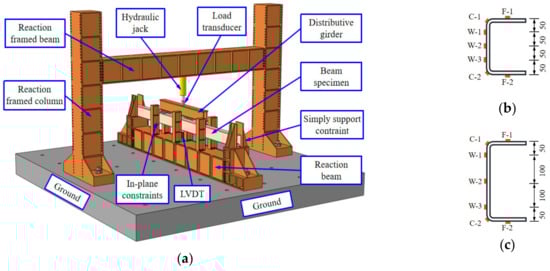 The bending tests were further conducted to evaluate the flexural behaviors of cold-formed steel channel beams. Figure 4 shows the equipment set-up for the four-point bending tests. The reaction framed columns and beam were installed to provide the counterforce. Moreover, the ground beam was fixed to the ground by anchors, and a couple of support devices were erected at the ends of beam specimens to provide the in-plane simply supported constraints. Three pairs of in-plane constraints were fixed to avoid the out-plane instability of channel beam specimens subjected to the vertical loads. A hydraulic jack of 1000 kN capacity was arranged for gradual loading with a 10 kN step. Moreover, aimed at monitoring the vertical load values, a load transducer was fixed at the top of the jack. A distributive girder was medially arranged on the top flanges of the steel channel beams, and its end supports were placed on the loading plates. A linear variable displacement transducer (LVDT) with a total stroke of 100 mm was installed at the lower flange in the middle section to record the deflection of the beam specimens. Figure 4b,c indicate the arrangement of strain gauges at the mid-span sections of cold-formed channel beam specimens. The strain gauges F-1 and F-2 were glued to the top and lower flanges of the channel beams, respectively. Three strain gauges named W-1~W-3 were bonded onto the webs at equal intervals. In addition, it should be mentioned that two strain gauges labelled C-1 and C-2 were stuck on the external surface of the upper and lower corner regions to obtain the strain response of the cold-bending part of the steel channel beam specimens.