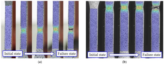 A series of axial tensile tests were performed on material specimens and the evolution of strain was investigated using the 3D DIC optical measuring instrument. The six flat coupons were TF-1, TF-2, TF-3, BF-1, BF-2 and BF-3, respectively, and the six corner coupons were TC-1, TC-2, TC-3, BC-1, BC-2 and BC-3, respectively. The strain nephograms were obtained by post-processing a series of speckle images, as shown in Figure 5a. It was found that typical necking deformations occurred at the average cross-sectional position of all flat specimens, fracturing at a displacement value of approximately 24 mm. Deformation was also consistently observed at fracture displacement values of approximately 7 mm for all corner specimens. In the cross-section of the flat samples, the necking deformations were occurred in the central area of the samples. However, in the other specimens, the necking deformations were produced at the boundary of parallel segments, as shown in Figure 5b. In the DIC system, the global deformation and strain information of the specimens was obtained. The failure states indicate that the plastic deformation of the corner samples are significantly limited compared to the flat samples due to the cold-bending action.