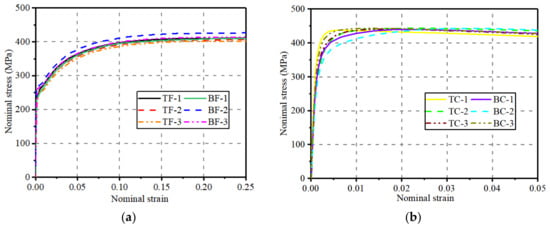 The engineering stress–strain curve was commonly used to describe the constitutive relationship. The stress–strain development was evaluated in present study disregarding the geometrical defects and residual stresses. Moreover, the reduction of the cross-sectional area was ignored under uniaxial load conditions for calculating cross-sectional stress. For flat coupons with rectangular cross-sections, the original thickness (df0) was measured using 3D digital speckle scanning and the original span of the central area of the section (lf0) was obtained using an electronic vernier caliper, so the original cross-sectional area (Afo) was calculated, and the engineering stress (σfe) was obtained from Equation (1). The gauge length (D0) of the observed area of the specimen was set to 120 mm and the axial engineering strain value was directly obtained. Through this method, the engineering stress–strain curve of the flat specimens (TF-1, TF-2, TF-3, BF-1, BF-2 and BF-3) was obtained, as shown in Figure 6a. Similarly to flat coupons, the original thickness (dc0) and the original outer arc length (lc0) of corner coupons with a quarter-circle cross-section were obtained applying the method of 3D digital scanning and the electronic vernier caliper, respectively, as shown in Figure 3a. Thus, the original cross-section area (Ac0) was gained, and the real stress (σce) was defined by Equation (2). This resulted in the determination of engineering stress–strain curves for the corner specimens (TC-1, TC-2, TC-3, BC-1, BC-2 and BC-3), as shown in Figure 6b.
