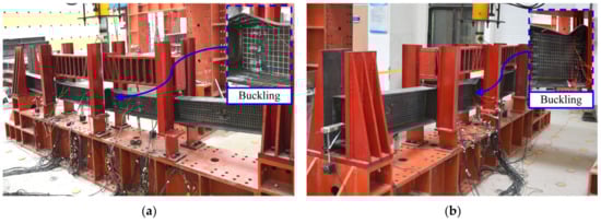The loading processes were carried out in the bending tests and deformations were observed. In the initial stage, the CFB-1 gradually bent with a continuous increase in deflection. When the vertical force reached 150 kN, the local buckling deformation began to occur at the upper flange in the mid-span section. As the load reached 196 kN, the global bending deformation and local buckling deformation in the cold-formed channel beam were considerably serious. Then, the mid-span deflection increased rapidly, and the failure load was 196 kN. Figure 7a shows the deformation state of the CFB-1 at the end of the test. A similar deformation and damage pattern were recorded for specimen CFB-2, as illustrated in Figure 7b. When the force reached 150 kN, the local bending deformation occurred in the upper flange, which became more obvious as the load increased. When the load reached 190 kN, the local deformation was clearly visible, and a loud noise could be heard. Then, the deformation increased rapidly while the load decreased. The ultimate load of specimen CFB-2 was indicated as 196 kN and the state of deformation at the end of the test is shown in Figure 7b.