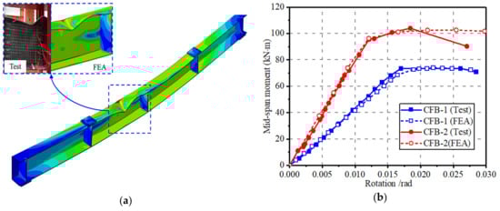 Comparison of experimental and numerical results: (a) Failure modes; (b) Mid-span moment-rotation curves.
