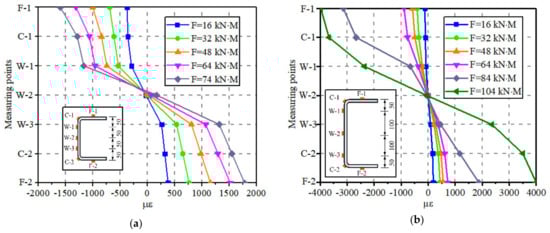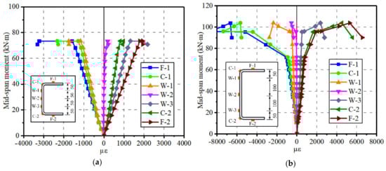 The stress–strain developing mechanism of the corner region was observed to change, compared to that of flat region in the steel channel sections owing to the cold bending action. Sectional strains were evaluated by a series of strain gauges. Figure 9 shows the mid-span moment versus the strain curves of cold-formed steel channel beam specimens. As the typical flexural member, the strain values of measure points (F-1, C-1 and W-1) in the compression zone basically correspond to those (F-2, C-2 and W-3) in the tension zone. In addition, the moment-strain curves of corner positions were close to those of the flange locations with a similar distance to the neutral axis. Figure 10 demonstrates the strain distributions of mid-span sections in beam specimens CFB-1 and CFB-2. The sectional strain distributions of cold-formed channel beams conformed to the plane section assumption. The strain developed linearly and distributed anti-symmetrically during the initial loading stage. As the loads increased, the plastic strains were produced in flanges, corners and web edges successively, while the strain distributions were still in accordance with the centrosymmetric regularity. Hence, it can be obtained that the corner parts maintained greater deformation compatibility with the flat parts in the steel channel beams subjected to vertical loads.