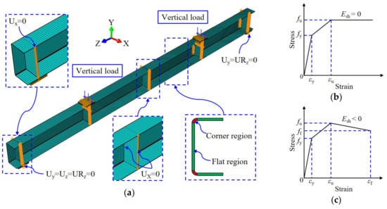 The stress response of corner and flat part in cold-formed steel channel beams was further investigated by the calibrated FE simulations in an Abaqus 2016 software environment []. Figure 11 shows the 3D FE models of the steel channel with a geometry, mesh, load and boundary condition. The geometry and dimensions were all set to be same as that of beam specimens in experiments. The initial geometric imperfections were introduced in FE simulations of steel components by several authors [,,]. It should be mentioned that this study mainly focused on the effects of cold working on the channel beams, thus the initial imperfections of cold-formed channels were disregarded. The displacements in the Y and Z directions together with the rotation in the Z direction were all initially constrained (Uy, Uz and URz = 0) in the left supporting position. The absolute restraints of displacements in the Y direction and the rotation in the Z direction were set in the right supporting part (Uy and URz = 0) for simulating the boundary conditions in tests. In addition, the restraints Ux = 0 were employed on the stiffeners for imitating the in-plane devices.