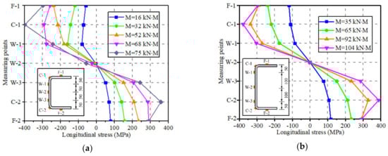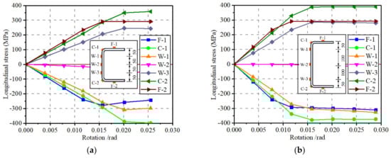 The stress development of mid-span sections of cold-formed channel beams was evaluated by calibrated FE simulations. The longitudinal stress-rotation curves at mid-span sections of the beam specimens are presented in Figure 12. It can be seen that the cross-sectional stress values are basically symmetric around the centroid axes. As the mid-span rotations increase, the stresses of flange, corner and web regions develop in accordance with their constitutive relationships, respectively, obtained by coupon tests. Moreover, it is indicated that the stress values of corner parts (C-1 and C-2) are higher than that of flange parts. The distribution feature is also illustrated in Figure 13. It is mainly because the corner regions were affected by the hardening effect of cold-bending behavior, which led to the greater stress response than flat locations at the same strain states. This means that the section stress states with the identical center distance did not keep consistent for the corner and flange parts. Hence, it is necessary to specifically assess the stress development of every part when calculating the bending properties of cold-formed steel channel beams.
