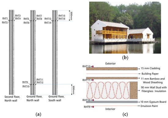 All data used in this study were collected from an experimental building located in the Huangshan Mountain district of Anhui Province, China, as depicted in Figure 1b. The building is a modern example of Hui-style residential architecture, constructed entirely of locally sourced bamboo and Chinese fir materials. The building was left in its natural state without heating or air conditioning to study its hygrothermal performance under regional climate conditions []. The use of the experimental building provides a unique opportunity to study the behaviors of building materials under natural conditions, without the confounding effects of heating and cooling systems. Moreover, the building’s construction using locally sourced materials highlights the potential for sustainable building practices that can benefit both the environment and local communities.