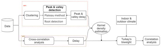 The research methodology is illustrated in Figure 2. Initially, the data analysis was conducted through two parallel work packages (WP1 and WP2). In WP1, a clustering analysis was performed (as detailed in Section 3.2.1) on the daily data segments to identify the most typical daily patterns. Subsequently, the peak and valley of the data segments were detected using two distinct methods proposed in this study, which are explained in detail in Section 3.2.2. The peak delay and valley delay were then used to represent the delay phenomena between adjacent sensors. The peak delay was determined by analyzing the difference between the peaks in the time domain, and similarly, the valley delay was determined. In WP2, the delay phenomenon between adjacent sensors was inferred through a correlation analysis, as explained in detail in Section 3.3.