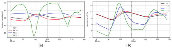 Figure 3 displays a two-day time series of smoothed RH and temperature data, which serves as an example in this study. The x-axis represents the index of the samples. Each increment of the index corresponds to a 10 min interval, as the data was collected with a logging time of 10 min. Consistent with our prior research findings in [], outdoor RH (RH12) and temperature (T12) were found to exert a dominant influence on the inwall’s RH (RH10-11) and temperature (T10-11). That is, RHT12 has the largest amplitude and dominates the RH and temperature variations inside the wall. For example, as can be seen in Figure 3a, the increase/decrease trends happen in RH12 first until it reaches its peak/valley, followed by RH11 increasing/decreasing subsequently until its peak/valley which corresponds to the peak/valley of RH12. In a similar way, RH10 subsequently follows RH11. The same relationship appears among temperatures, as can also be observed in Figure 3b. In short, RHT12 was observed to be positively correlated with corresponding changes in the RH and temperature inside the wall.