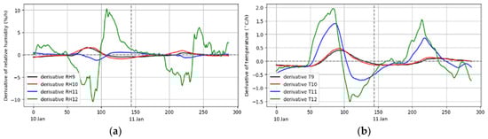 An example of the derivative of a two-day time series after smoothing: (a) relative humidity; (b) temperature.