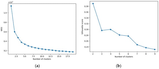 The purpose of clustering analysis is to aggregate the daily time series with similar patterns into the same cluster to identify the general patterns with better accuracy. Performing the k-means clustering on the preprocessed data with ranging from 1 to 19; the elbow plot is shown in Figure 5a.