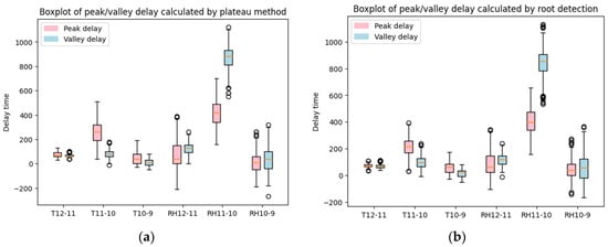 Figure 6b illustrates the distribution of peak/valley delay calculated using the root detection method. As can be observed, there is no significant difference from the boxplots in Figure 6a. To further compare these two different peak/valley detection methods and their results, Section 4.3 offers a detailed and comprehensive comparison of the delays obtained from different methods.
