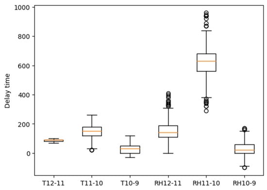 Based on the methodology described in Section 3.3, the delays between every pair of adjacent sensors were calculated for each day. The distribution of these delays is presented in the form of a boxplot in Figure 7. Additionally, a more detailed histogram distribution of the delays can be found in Appendix B.