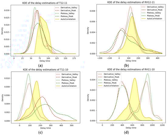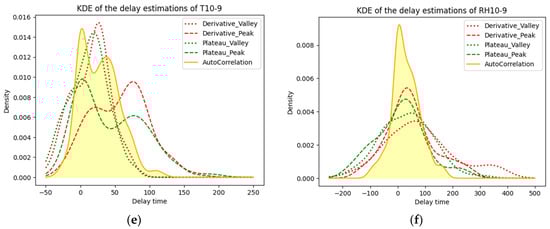 KDE of the delay between (a) T12 and T11; (b) RH12 and RH11; (c) T11 and T10; (d) RH11 and RH10; (e) T10 and T9; and (f) RH10 and RH9.