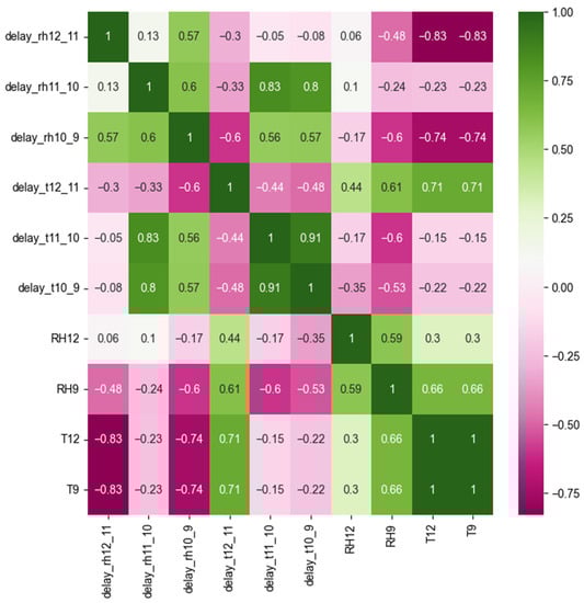 As discussed in [], the monthly average RH peak delay time between RH11 and RH12 decreased as the outdoor monthly average temperature increased. In this study, we build upon this analysis by exploring the relationships between all adjacent sensor pairs and the indoor and outdoor climate variables. Specifically, we aggregated the daily delays, calculated using the cross-correlation method, to the monthly delays by computing the biweight center of the daily delays within each month. Similarly, we computed the monthly biweight center of the outdoor and indoor climate data series (RH12, T12, RH9, T9). We then calculated the Spearman correlation coefficients between the monthly biweight centers of the delays and the monthly biweight centers of the indoor and outdoor climate variables.