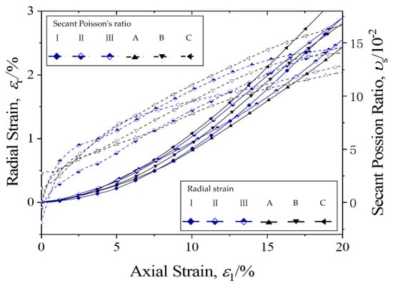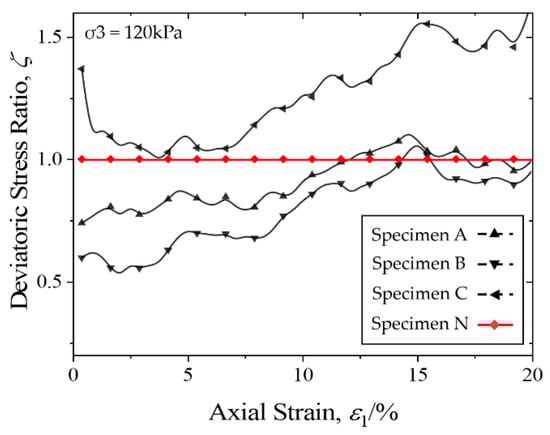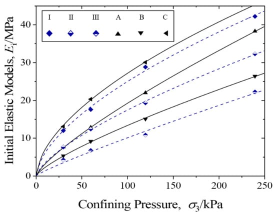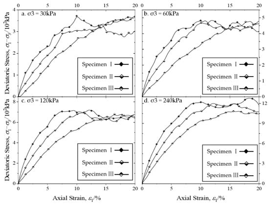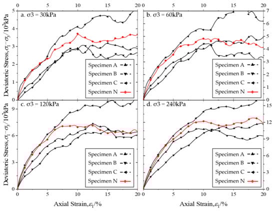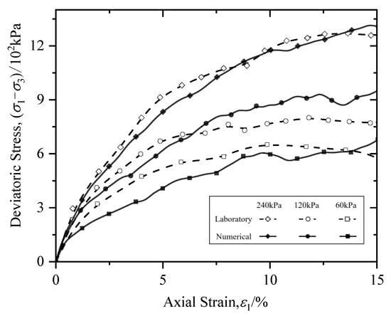 - The maximum deviatoric stress and the shear strength of the samples with higher angularities were significantly larger than those with medium and low angularities, while the final deviatoric stresses of samples with different gradations were nearly the same. Meanwhile, the initial elastic modulus increased when the curvature coefficient of the gradation curves became larger.