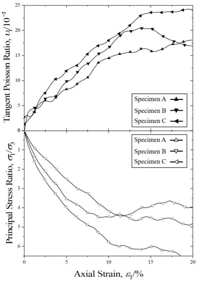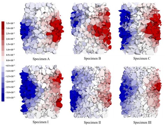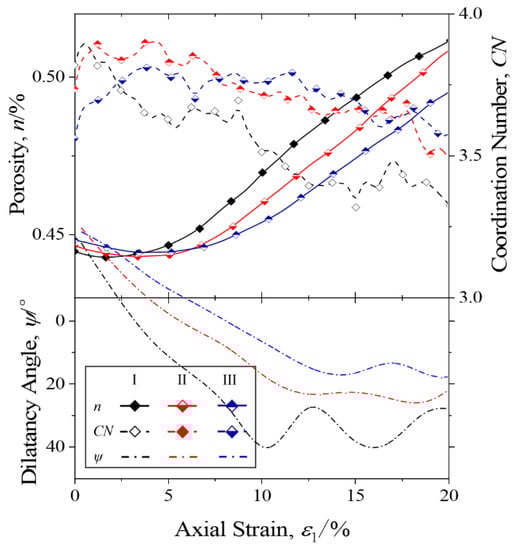 - The changes of porosity (n), coordination number (CN), and shear expansion angle (ψ) during the compression tests were compared. It was found that the coordination number is the most sensitive microscopic index, which usually reached the maximum value and started to decrease when the axial strain was about 2–3%. On the contrary, in the other two cases, the axial strain corresponding to the extreme value was often greatly delayed. Therefore, it can be conjectured that the contact force and the number of particles was the fundamental reason for the difference in the mechanical behavior of different samples. This is also proven by the fabric changes of the samples.