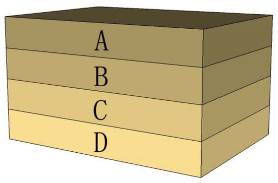 When the number of gradient layers is 4, the thermal stress and stress concentration area between the gradient layers are minimized, and the internal tensile stress of the material reaches the minimum value []. Using four layers of functionally graded fiber-reinforced cement-based composites, the strength and fracture function of the gradient specimen designed by the gradient design are increased by about 50% compared with the homogenous specimen []. Based on the determination of inorganic admixture and modified jute fiber content, the gradient design test was carried out, in which the gradient layer was designed to be 4 layers and the size of each layer was equally divided, as shown in Figure 1.