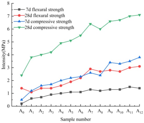 Figure 2 shows the strength development pattern of modified raw-soil-based wall materials with the content of inorganic admixture changing continuously. Combined with the analysis of Figure 2 and Table 2, it can be seen that the strength of modified raw-soil-based wall materials shows an increasing trend with the increase in the proportion of cement in the admixture, and the effect of modified materials on its compressive strength was obviously better than that of the flexural strength. This is similar to the results of Kim, who noted that the unconfined compressive strength of raw soil increases with the increase in cement content []. From the strength changes of A5 to A6 and A7 to A8, it can be seen that under a certain amount of cement, the compressive and flexural strength can be further improved by appropriately increasing the content of fly ash and decreasing the content of lime; in particular, the strength change over 28 d is more obvious. From the strength changes of A9 to A10, it can be seen that when the cement content is further increased, the effect of the change in the content of fly ash and lime on the strength of the modified raw-soil-based wall materials will be weakened. When the mixing ratio of cement, fly ash and lime is 14:3:3, the compressive strength and flexural strength of 7 d reached 3.8 MPa and 1.4 MPa, respectively, which were 6.6 times and 6 times higher than those of the raw soil specimen without inorganic modified materials. When the age reached 28 d, its compressive and flexural strengths reached 7.1 MPa and 3.1 MPa, which were 1.9 times and 2.1 times higher than those of 7 d, indicating that the strength of the modified raw-soil-based wall materials improved with the increase in the length of the curing period. This is because fine cement and fly ash particles fill in the voids of raw soil particles, reducing the number of voids. With the increase in age, the cement further reacts fully and generates more hydraulic gelling products, which enhances the cohesion between the loose raw soil particles and thus improves the strength of the specimen []. At the same time, fly ash will also react with Ca(OH)2 to form gel, which will closely link the soil and further improve the strength of the modified raw-soil-based wall material. The compound additions of several admixtures can complement each other and effectively avoid the damage or fracture of raw-soil-based wall materials caused by internal structural defects [].