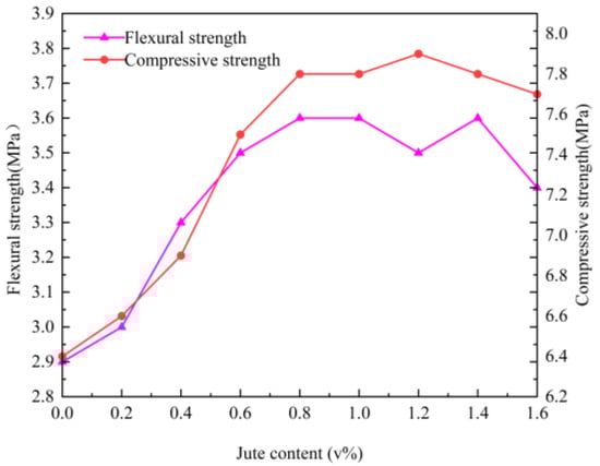 Figure 3 shows the influence of modified jute fiber content on the mechanical properties of modified raw-soil-based wall materials. Under the condition that the mechanical properties meet the requirements, the influence of jute on the mechanical properties of inorganic modified raw soil-based wall materials is further discussed. The proportion of admixture in the modified raw-soil-based wall material was 20 wt%; the proportion of cement, fly ash and lime was 10 wt%, 6 wt% and 4 wt%, respectively. It can be seen from Figure 3 that when the jute content was 0.8 v%, the compressive and flexural strengths of the modified raw soil specimen were 7.8 MPa and 3.6 MPa, respectively, which were 22% and 24% higher than those of the raw soil materials without modified jute fiber. This is because the surface of the modified jute fiber is rougher and has a higher degree of bonding with the raw-soil-based material. Under the action of external force, due to the strong bonding force between fiber and soil-based materials, fiber will consume some of the energy in the process of pulling out, delaying the development of cracks, so the strength of soil-based material can be improved, which is similar to the net root system of the plant to fix the soil. In addition, when the content of jute fiber is less than 0.8 v%, the strength of the modified raw-soil-based wall material increases with the increase in the fiber content, but when the content exceeds 0.8 v%, the compressive strength and flexural strength have a downward trend. Considered comprehensively, 0.8 v% is set as the optimum content of modified jute.
