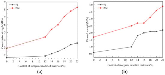 Effect curve of inorganic modified material (cement, fly ash and lime) content on mechanical properties of raw-soil-based material. (a) Compressive strength. (b) Flexural strength.