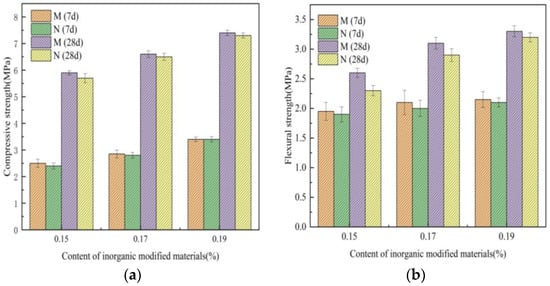 Effect of gradient modified material content on mechanical properties of raw-soil-based materials. (a) Compressive strength. (b) Flexural strength.