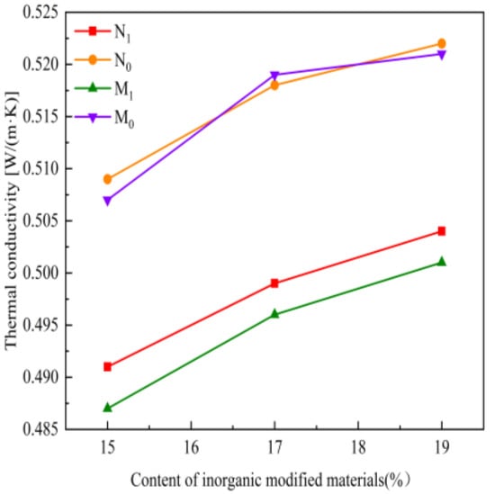 Effect of gradient modified material content on thermal conductivity of raw-soil-based materials (M1 and M0 represent the gradient distribution specimens with and without jute fibers, respectively. N1 and N0 represent homogenous distributed specimens with and without jute fiber, respectively).