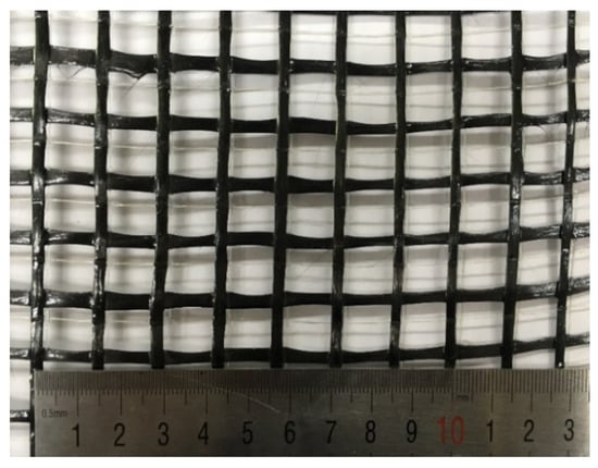 Figure 1 shows the carbon-fiber textile used in this study, which was manufactured by Shanghai Lishuo Composite Material Technology Co., Ltd. (Shanghai, China). The average mesh size and clear spacing between the rovings of the carbon-fiber textile used in this study were approximately 14 mm and 12 mm, respectively. Because the outer surface of the carbon-fiber textile supplied by the manufacturer had no separate coating, the textile was additionally coated with a low-viscosity epoxy resin to improve bonding to the cement matrix. In addition, the carbon-fiber textile could easily be fixed inside the specimen because the coating increased the rigidity. Table 2 lists the material properties of the carbon-fiber roving used in textiles provided by the manufacturer. However, the geometry of each roving of the textile used in the test differs slightly, as shown in Figure 1. Accordingly, there may be uncertainty about the properties of Table 2.