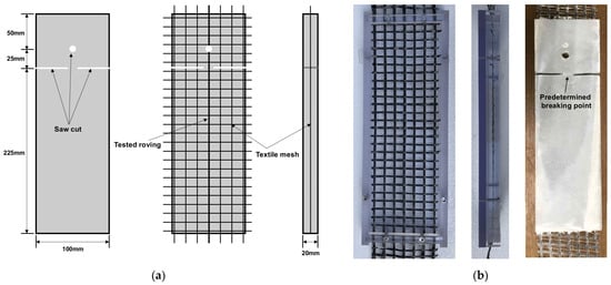 Therefore, a double-sided unsymmetrical pull-out test was performed in this study to investigate the bond stress–slip relationship in TRM. Figure 2 shows the geometry and preparation of the pull-out test specimen based on the test set-up designed by Krüger []. The specimen dimensions were 300 × 100 × 20 mm3, and a layer of textile mesh was embedded in the middle of the mortar specimen. The reinforcement embedment length was asymmetrically set to 25 mm and 50 mm through saw cutting. Double-sided saw cutting ensured the upper anchoring area was constrained by a specific positioning of a predetermined breaking point. Additionally, a chosen anchoring length of 225 mm in the lower part of the specimen is generally sufficient for secure anchoring []. To ensure a consistent embedded height of the mesh in the specimen, the edge of the textile mesh was fixed to the mold before casting. In general, the peak load of the prestressed TRM increases as the slip decreases, resulting in brittle behavior []. Therefore, embedding at the correct position was carefully ensured to prevent generating pretensile force and to prevent bending while installing the textile mesh in the specimen, thus minimizing the prestress that may occur in the textile mesh. The specimen was demolded 24 h after casting, followed by curing in water for 28 days at 20 ± 0.5 °C.